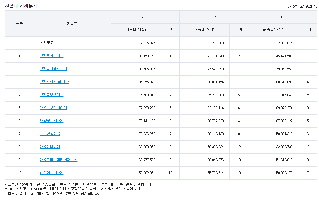 * NICE기업정보 Bigdata 기준 국내 인쇄 업체 순위를 기반으로 정리한 내용입니다.