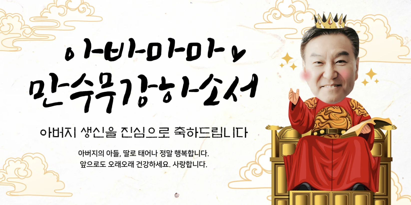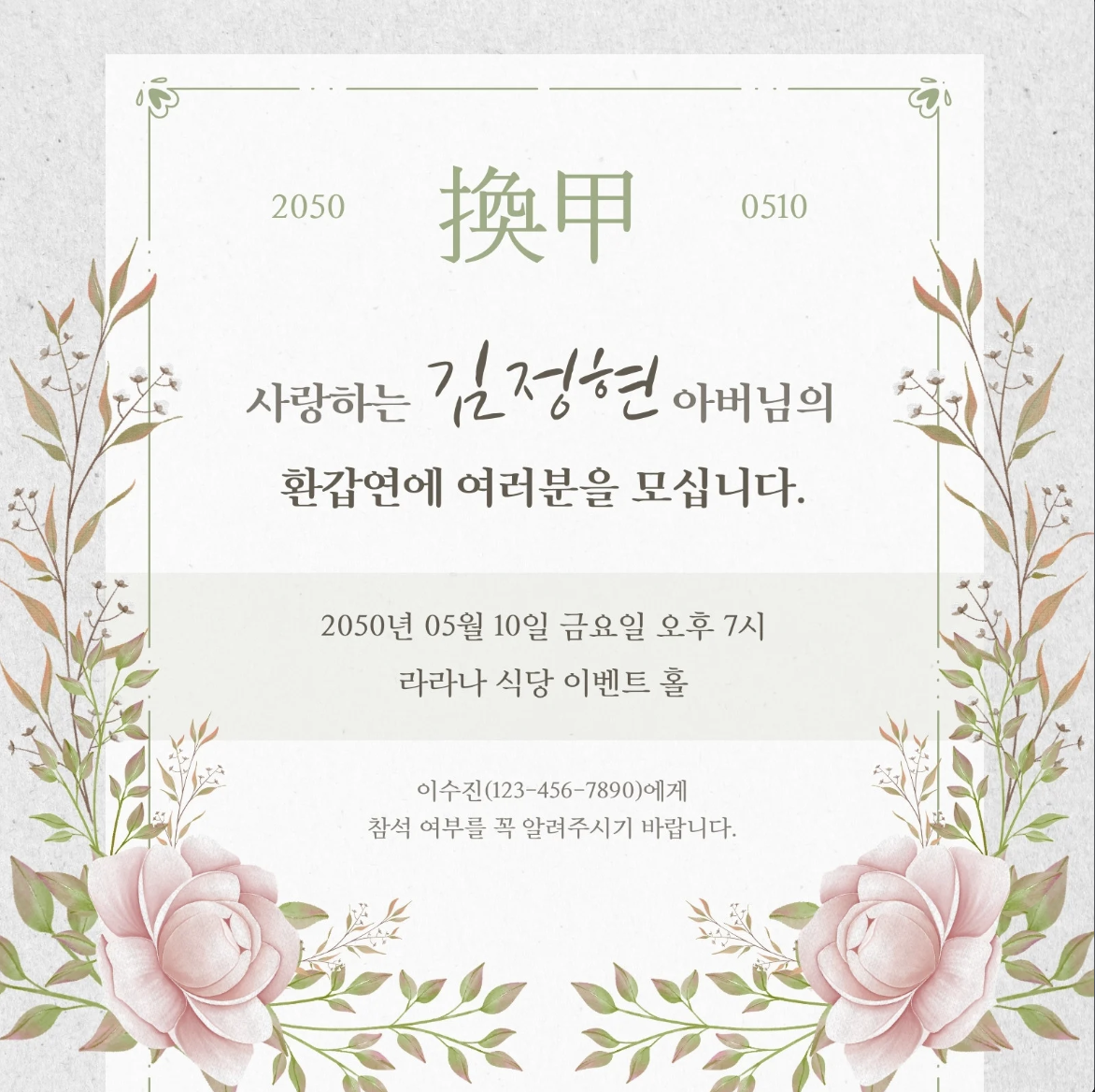 초대장 문구 : 사랑하는 김정현 아버님의 환갑연에 여러분을 모십니다.