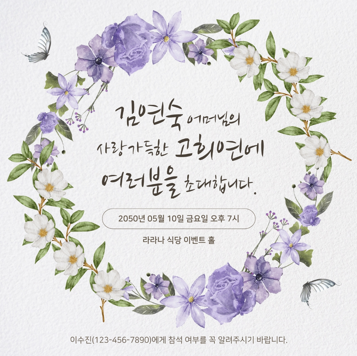 초대장 문구 : 김연숙 어머님의 사랑 가득한 고희연에 여러분을 모십니다.
