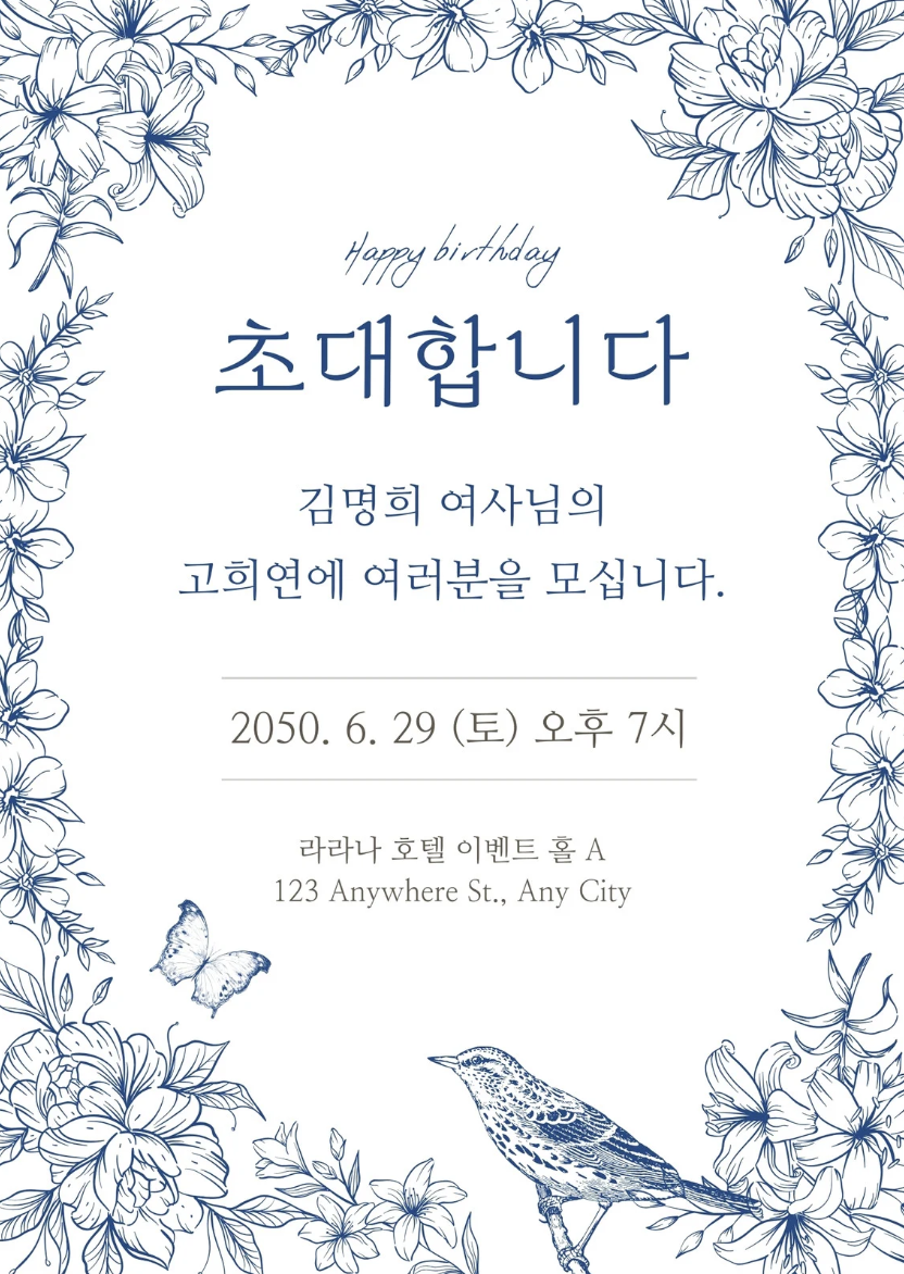 초대장 문구 : 존경하는 김춘희 여사님의 생신을 축하드립니다